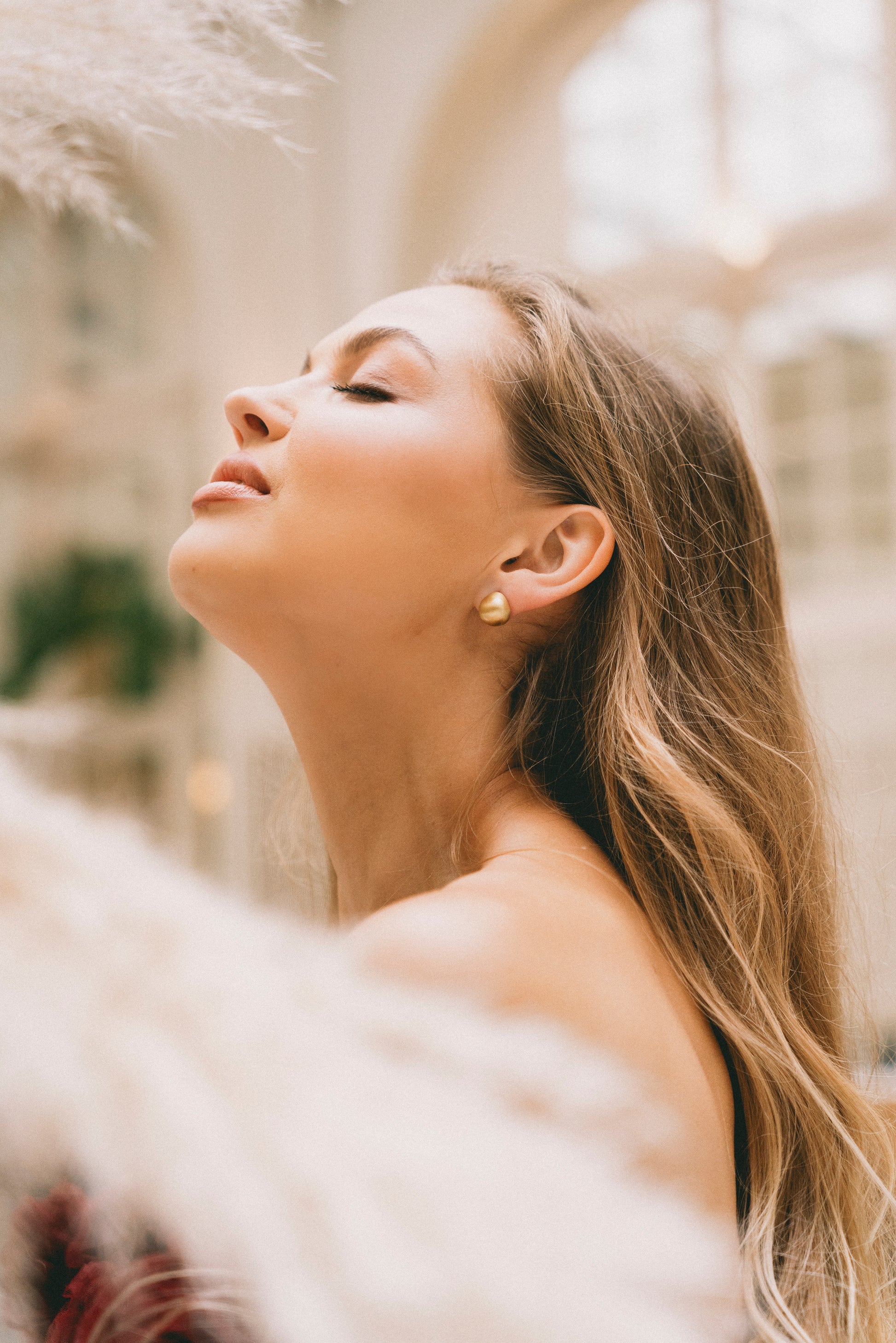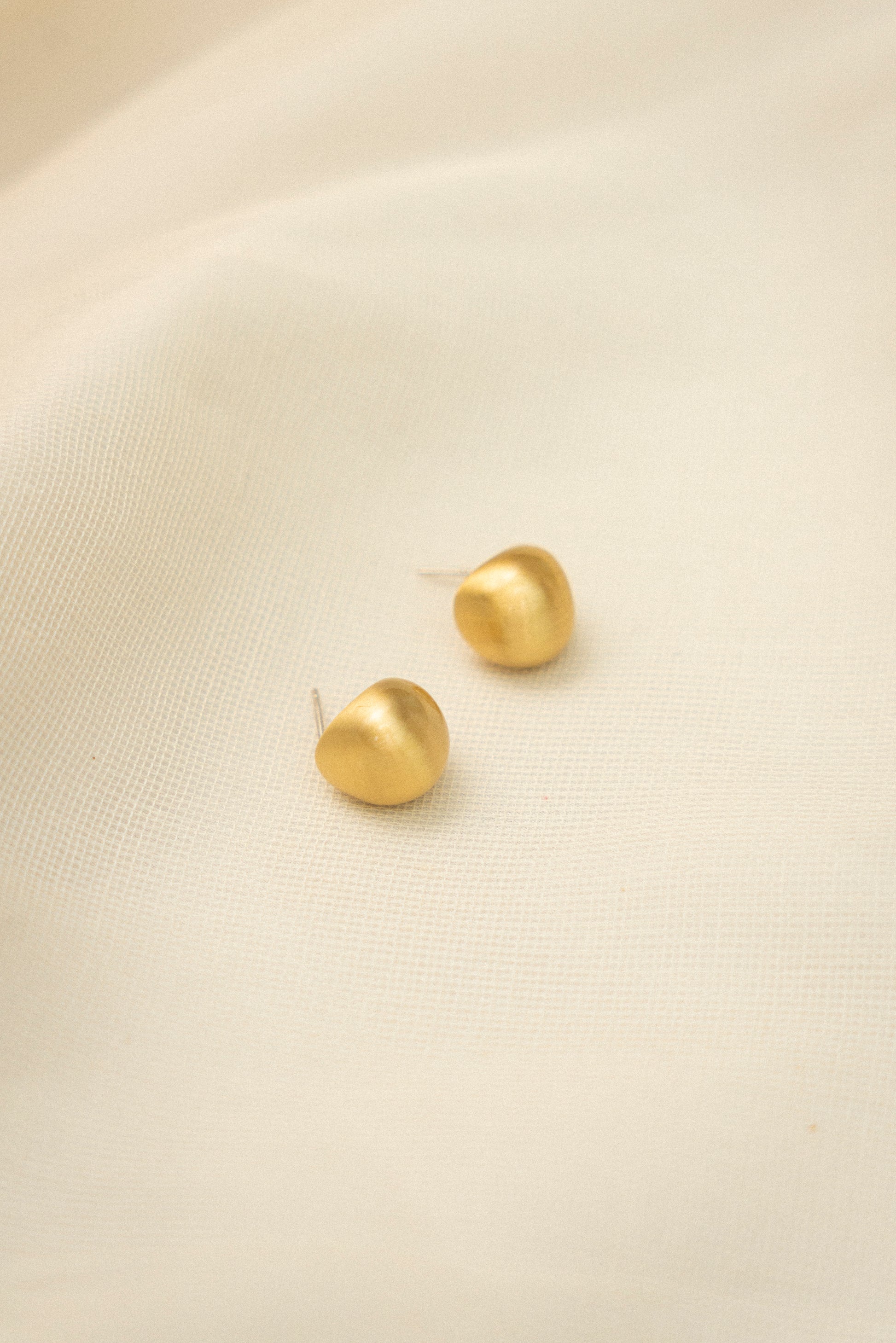 Inspired by the purity of morning dew, these sculptural studs reinterpret the classic drop with modern fluidity. Their organic, rounded shape catches the light with a satin-like sheen, creating a warm, glowing effect. Plated in 18kt gold, they offer an understated yet luxurious finish perfect for adding a quiet statement to any look.