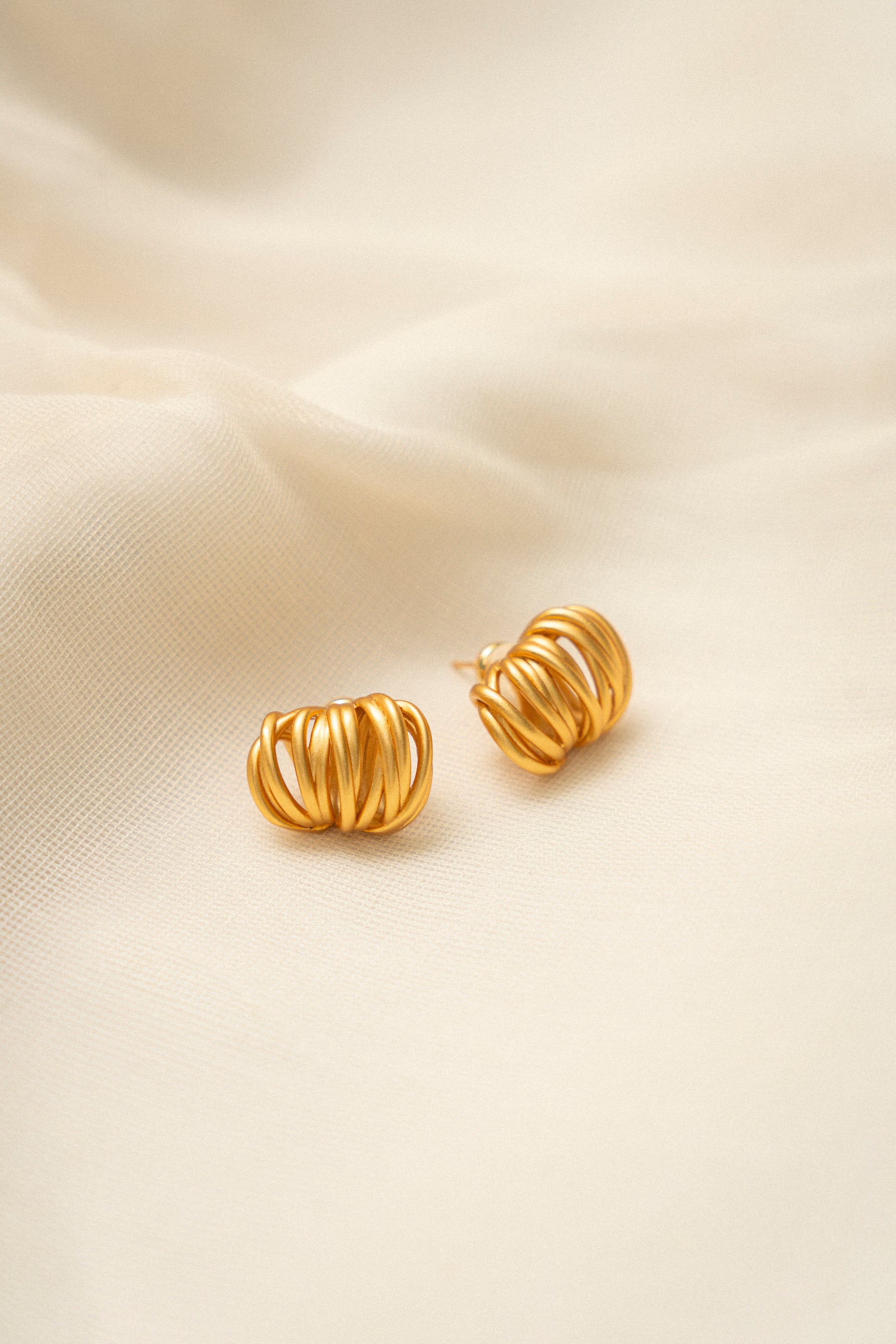 The Golden Vortex earrings are an exquisite, intricately twisted strand design, gracefully woven into a refined, cluster like silhouette. 18KT Gold Plated.