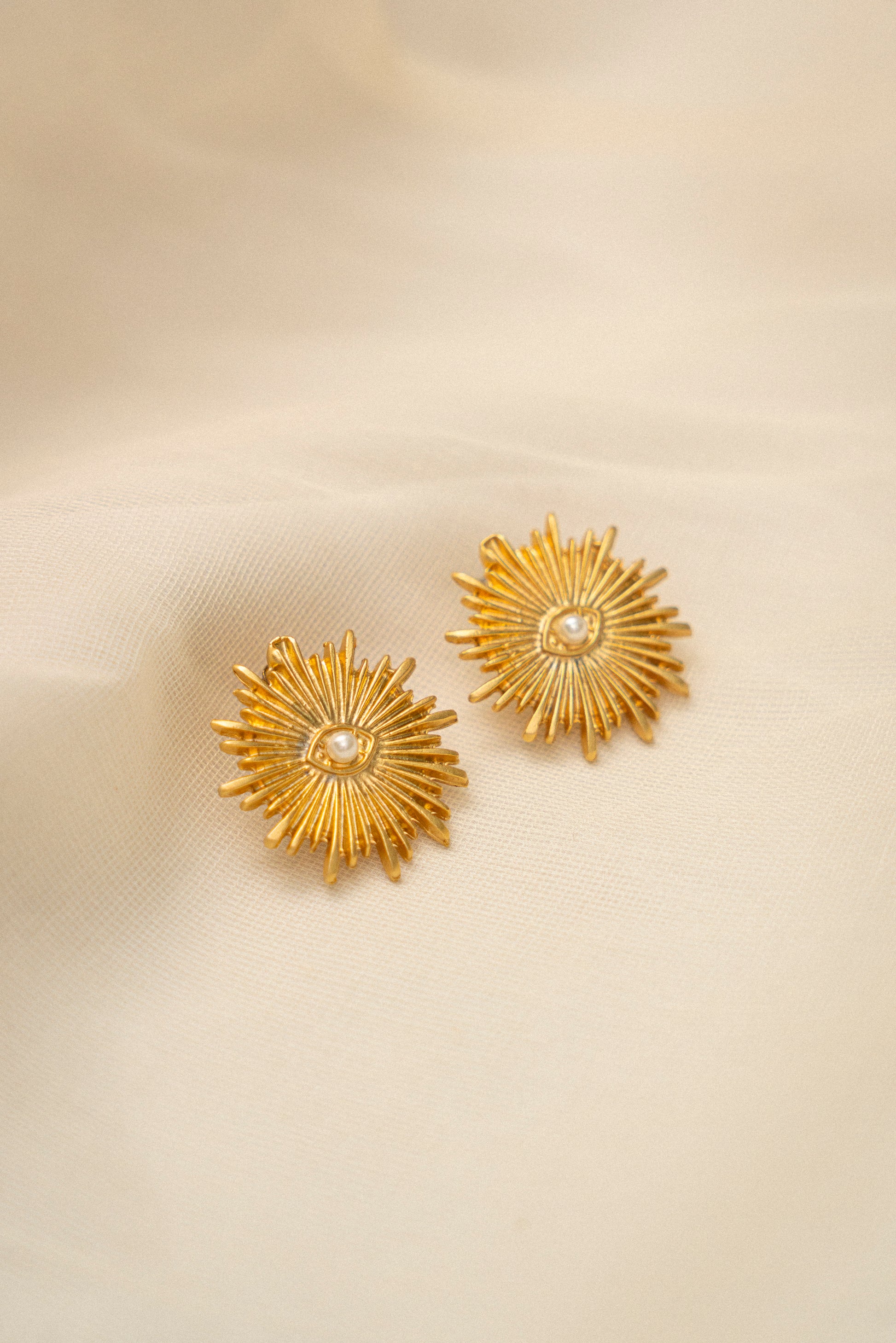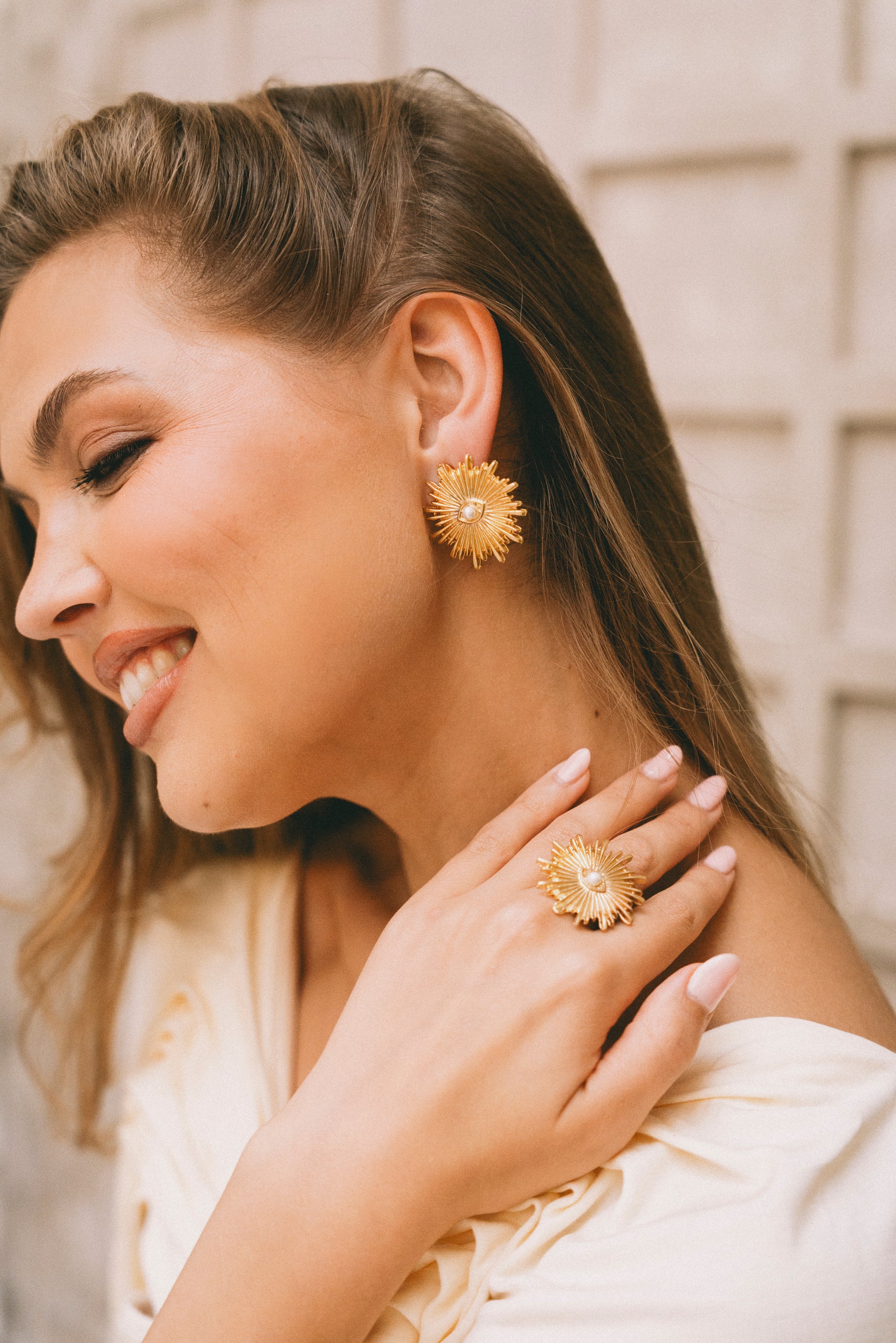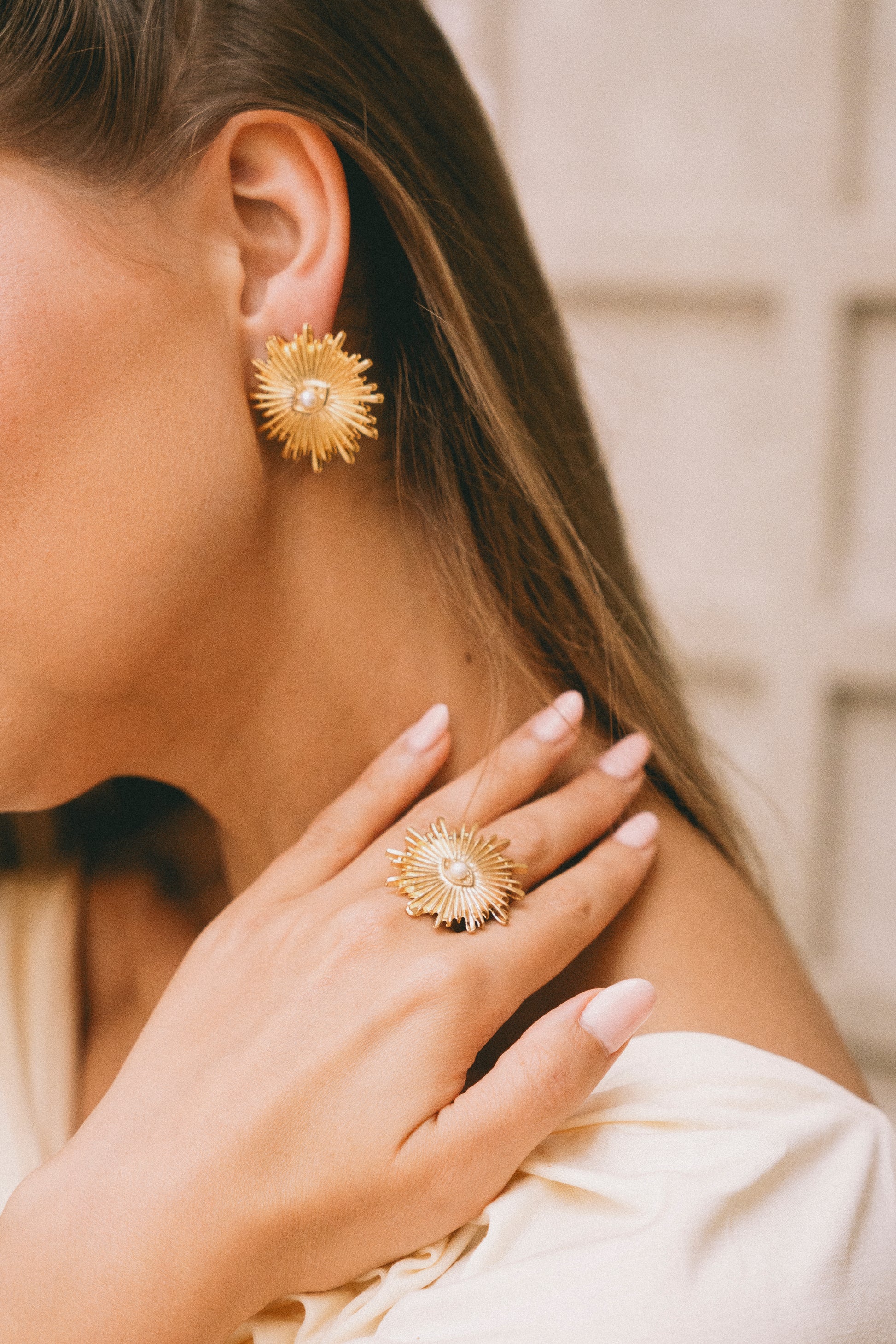 The rays surrounding the eye create a sense of movement and light, inspired by the harmony of natural forms, perfect for adding a thoughtful touch of elegance to your look.