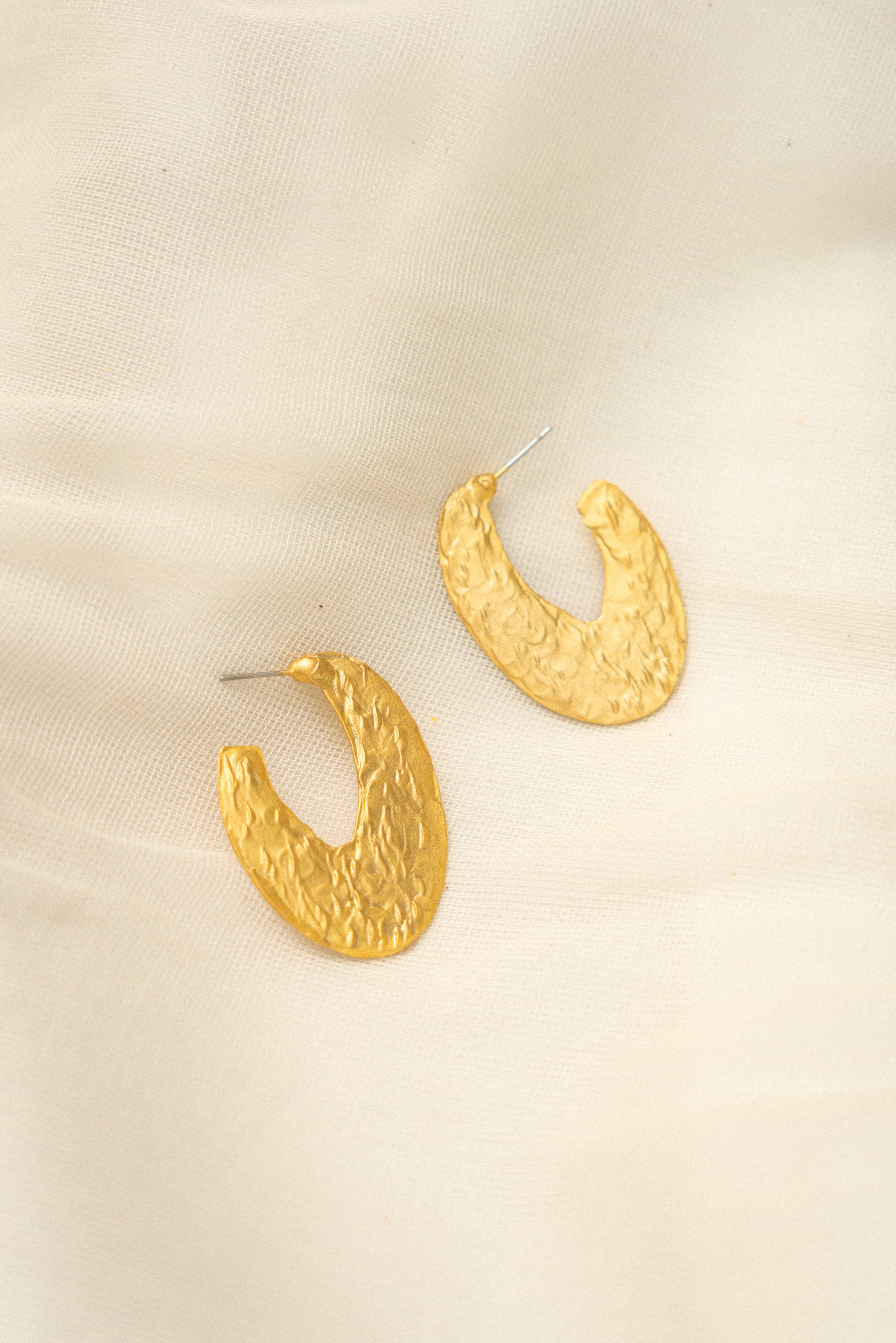 These elegant gold plated earrings feature a bold crescent shape with a beautifully textured finish that adds depth and character. The design combines contemporary minimalism with an artisanal touch, offering a versatile accessory for any occasion. Their radiant gold tone enhances their timeless charm, while lightweight construction ensures comfort for all day wear.