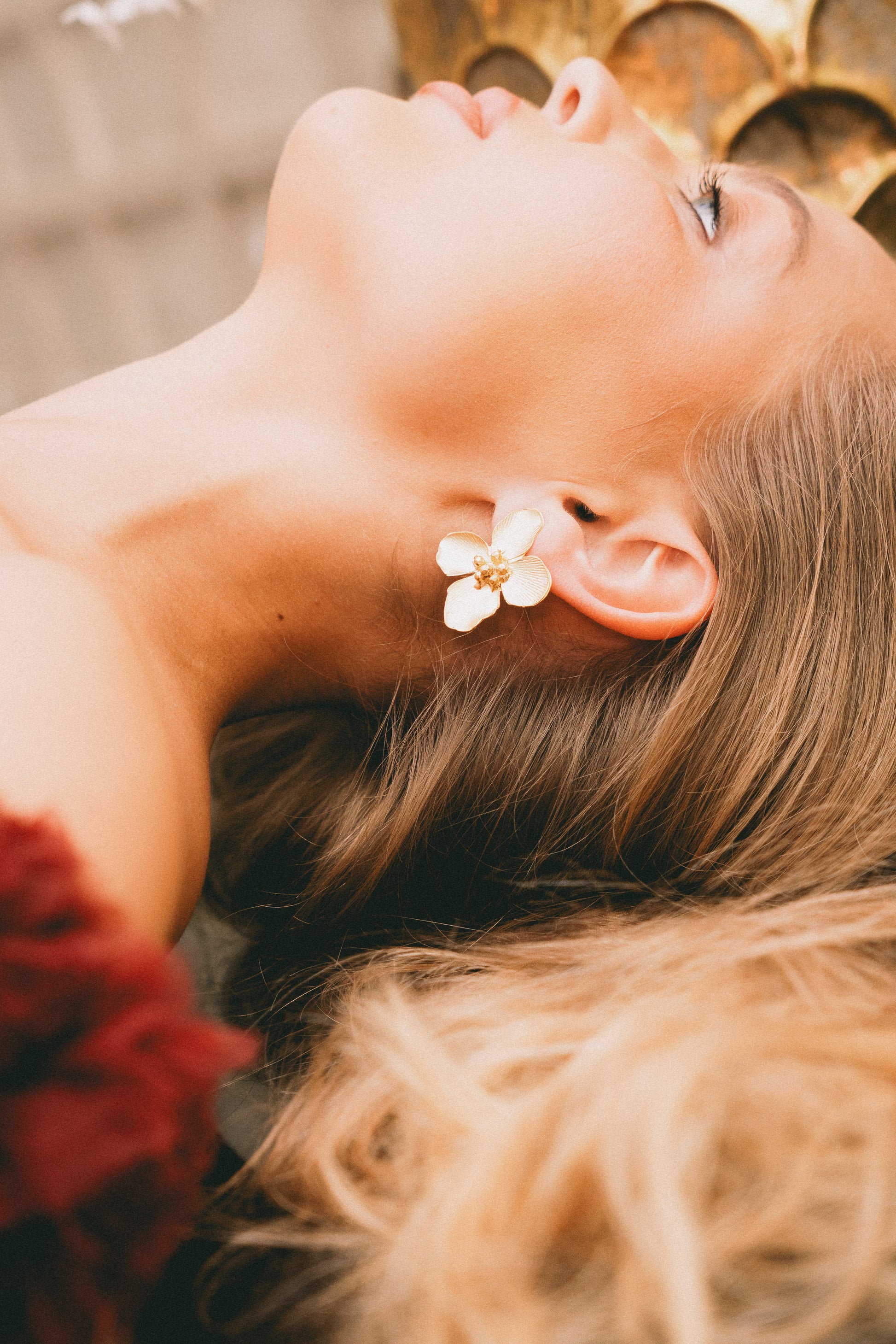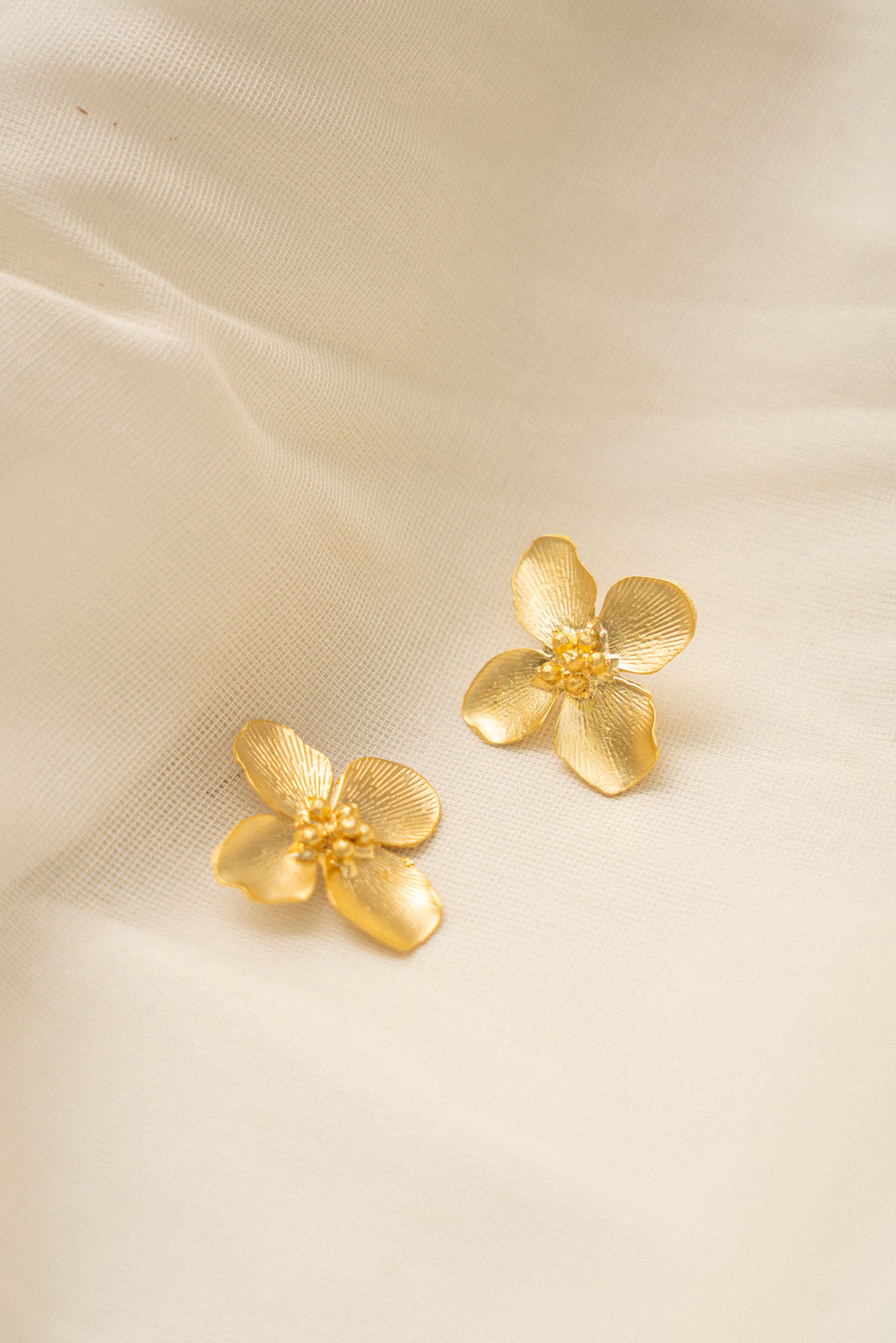 These gold plated earrings feature intricately textured petals and a sparkling clustered centre, echoing the beauty of fresh blooms.