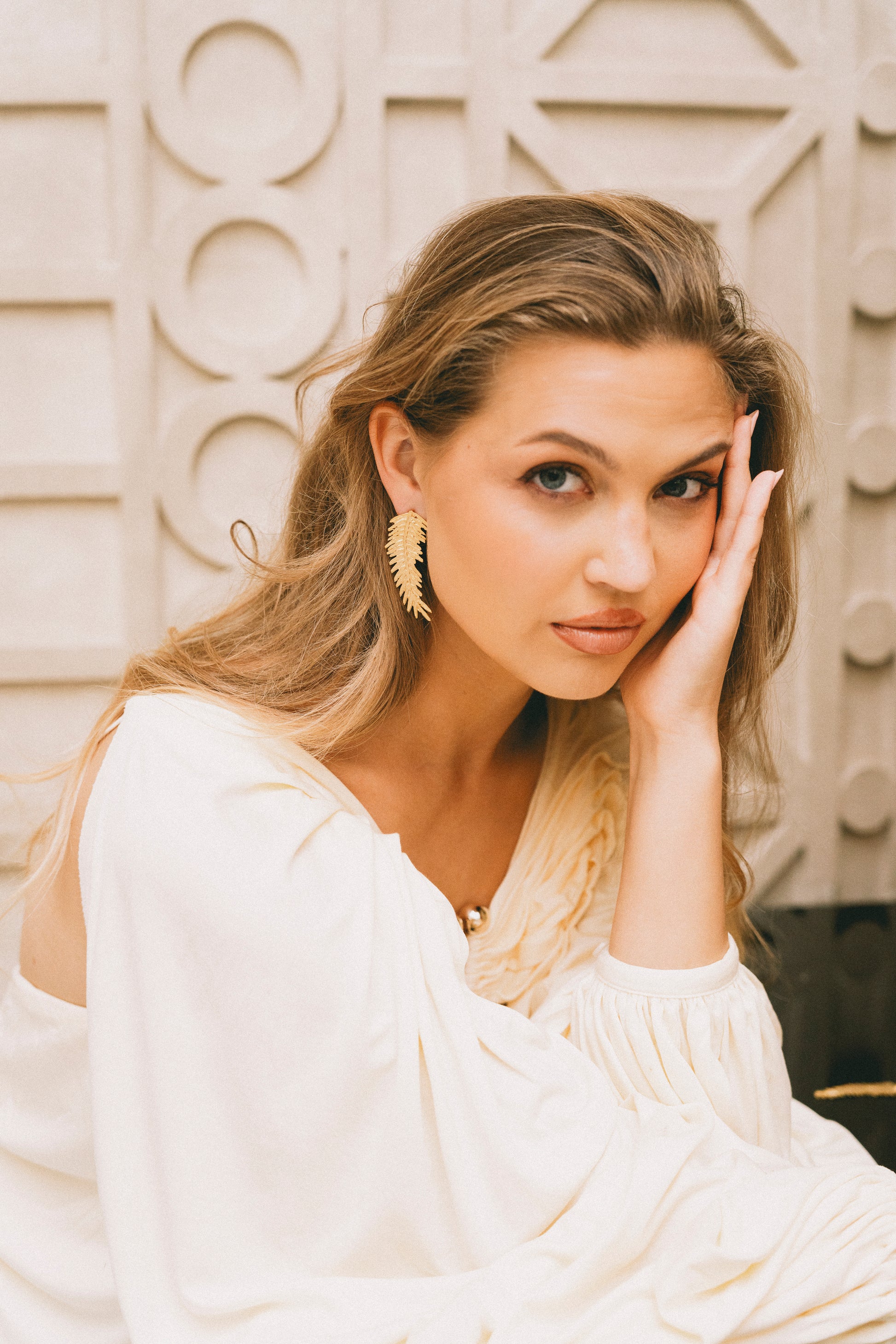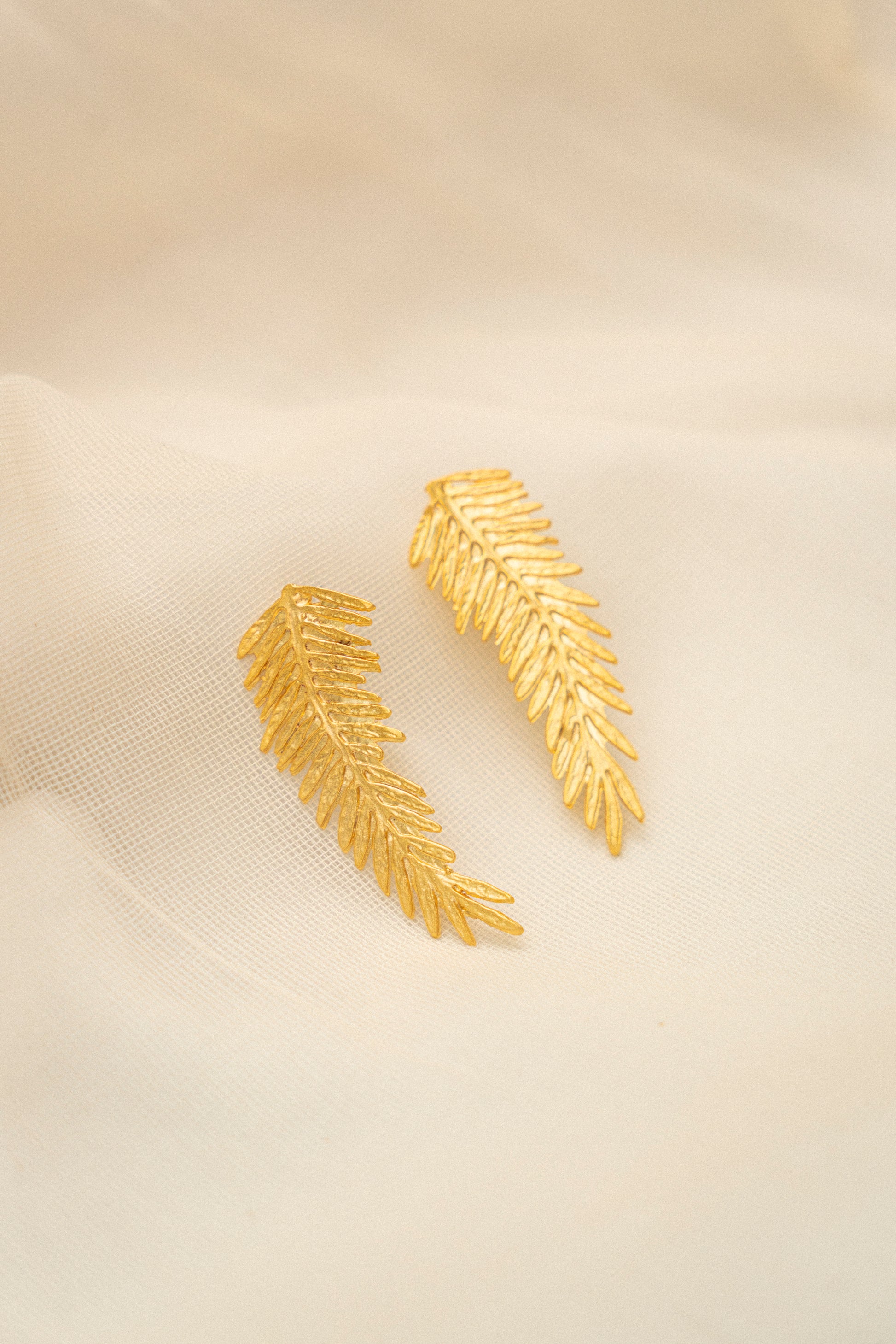 These earrings feature an elegant leaf-inspired design, crafted in gold with intricate detailing that mimics the delicate texture of real foliage. The elongated, feather-like shape gives them a sophisticated and nature-inspired aesthetic, perfect for adding a touch of organic beauty to any outfit.